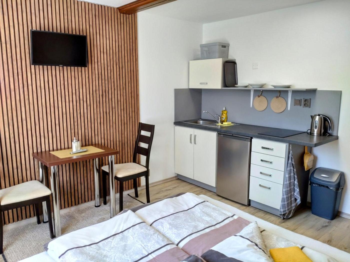 Double Room. Offering free toiletries, this double room includes a private bathroom with a shower and a hairdryer. Guests can make meals in the kitchenette that is fitted with a stovetop, a refrigerator, kitchenware and a microwave. The double room comes with a flat-screen TV, a wardrobe, an electric kettle, as well as heating. The unit has 1 bed. ;
